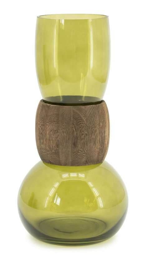Jarrón fabricado en cristal color verde, con detalle en madera color nogal americano acabado rústico y mate.