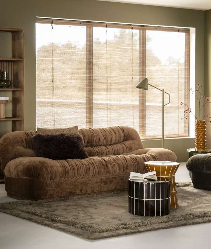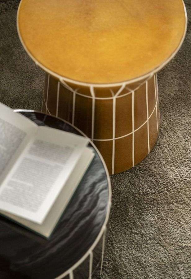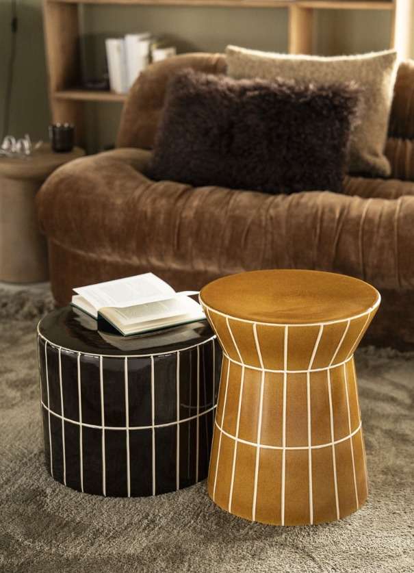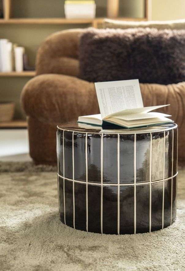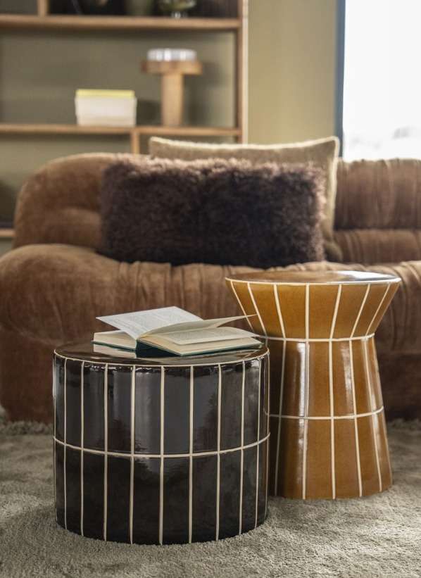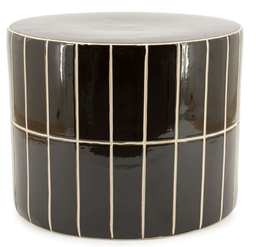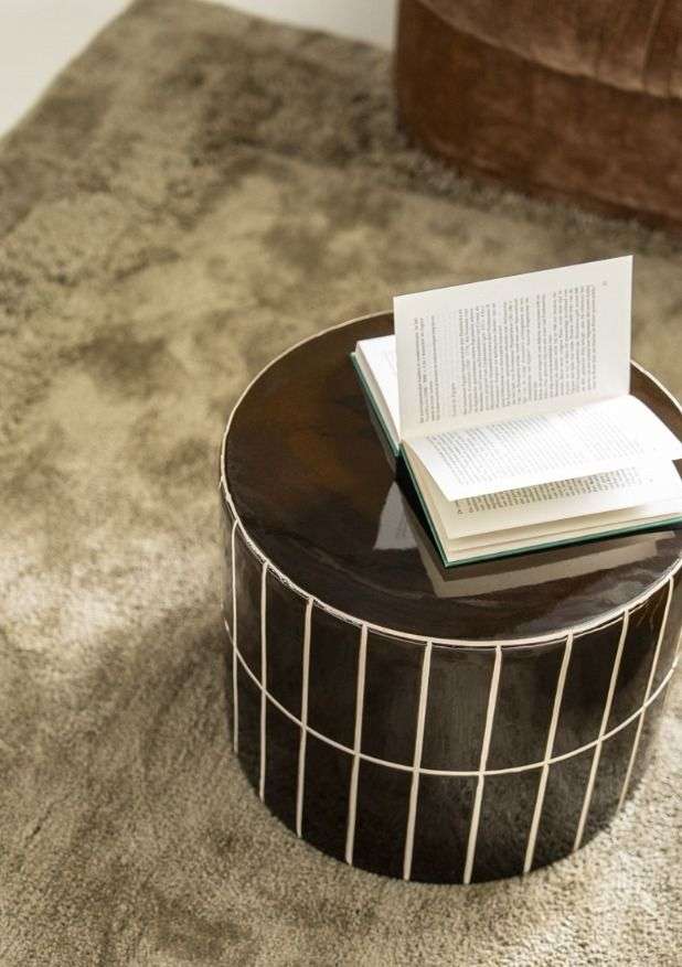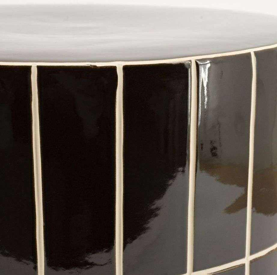 Mesita auxiliar fabricada con cerámicas en color marrón, acabado brillante. Borada en blanco roto.