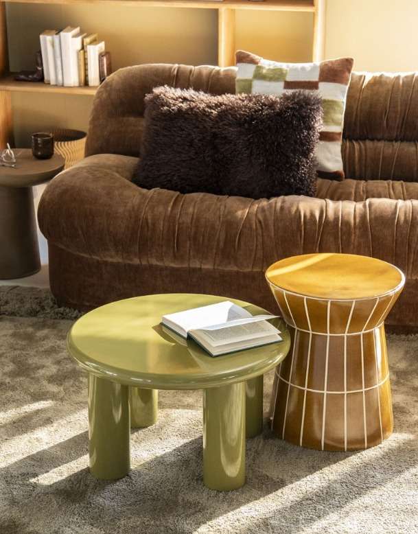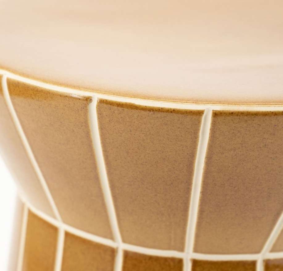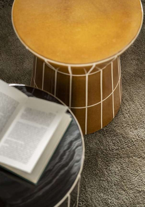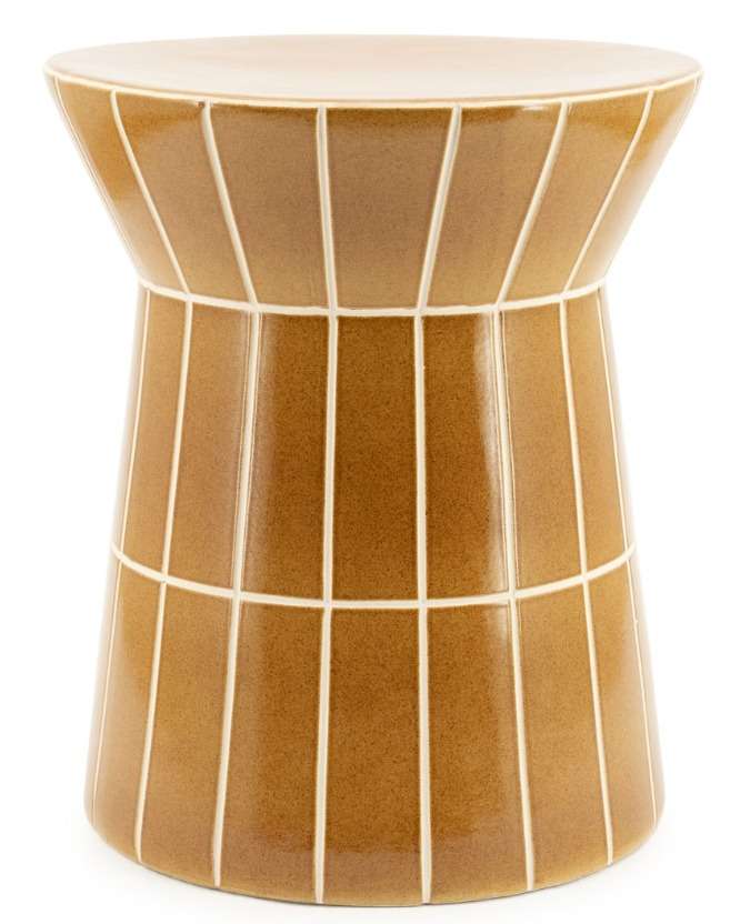 Mesita auxiliar fabricada en cerámica color mostaza, vorada en color blanco roto.