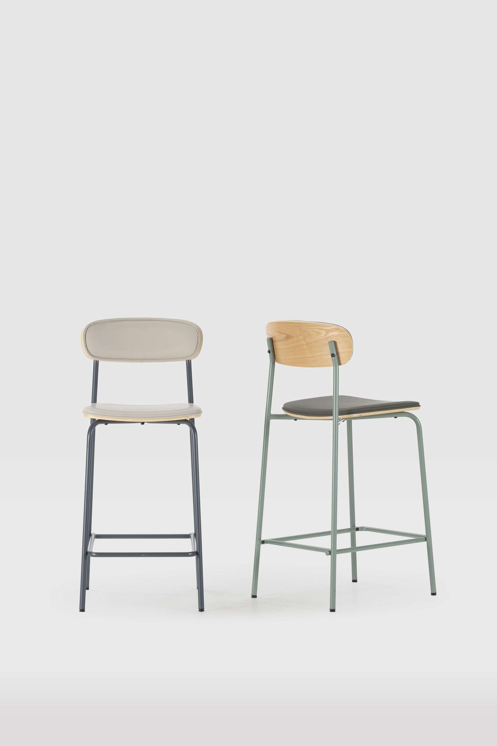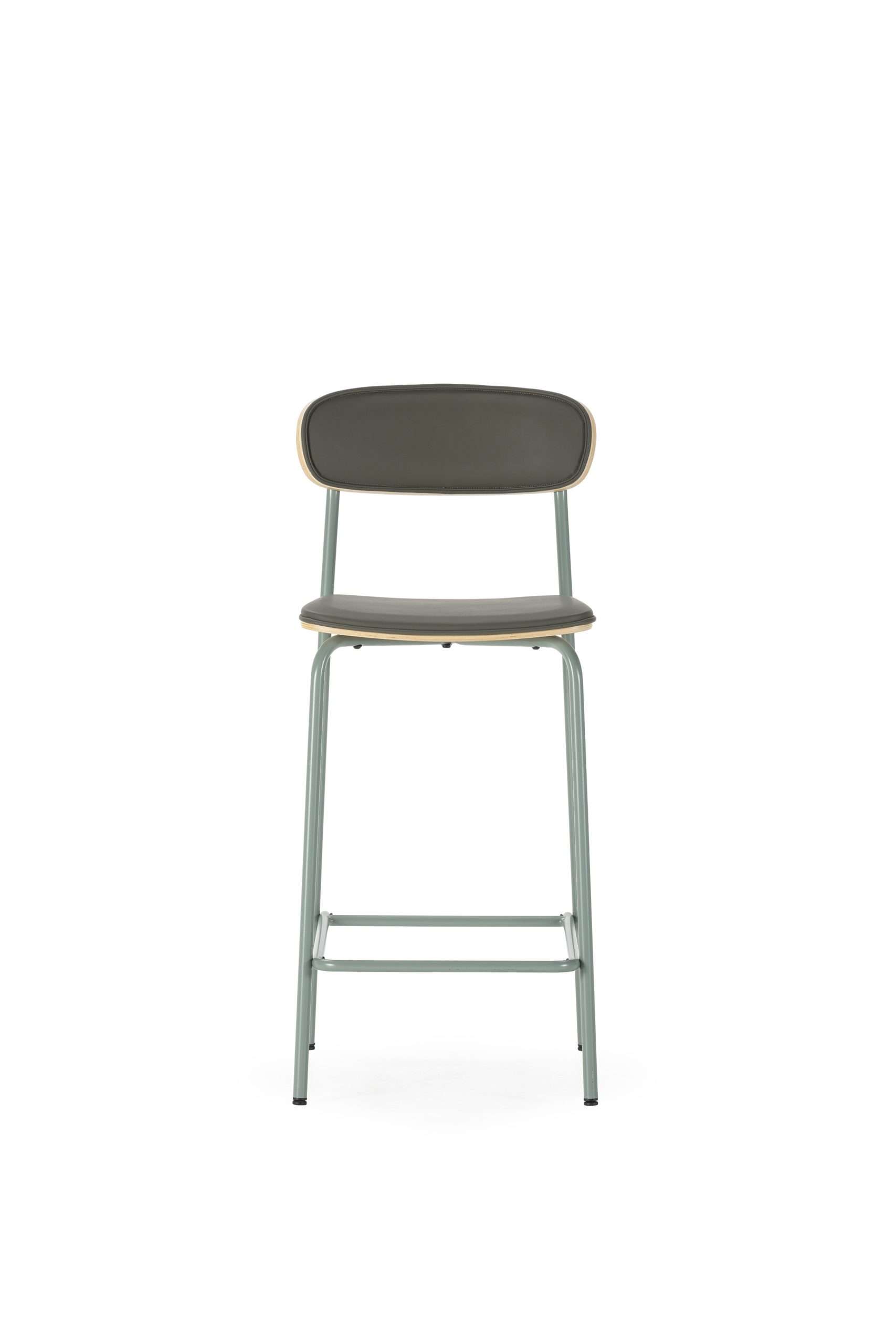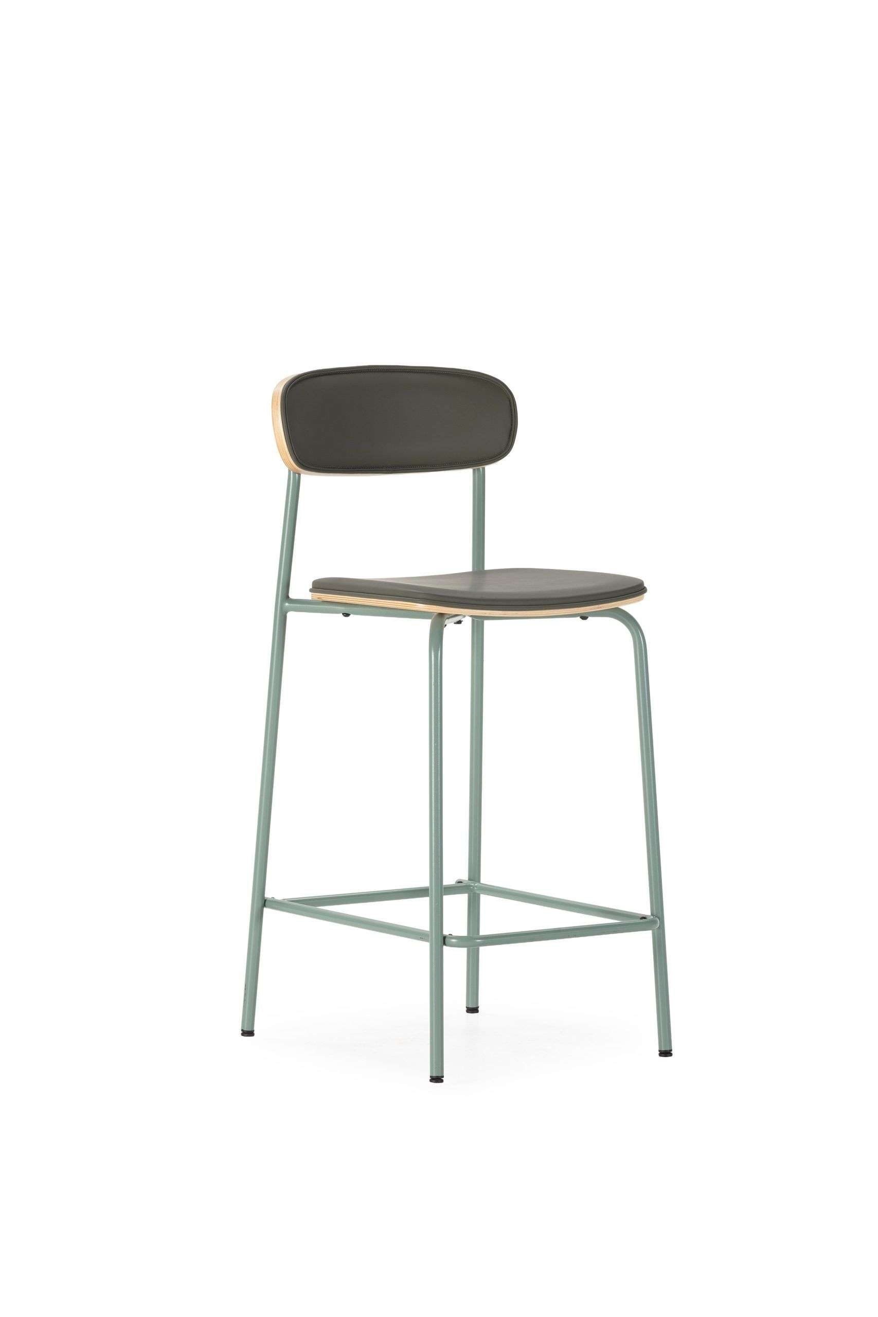 Taburete con estructura metálica en color verde, asiento y respaldar en polipiel color verde, trasera respaldo en madera color natural.